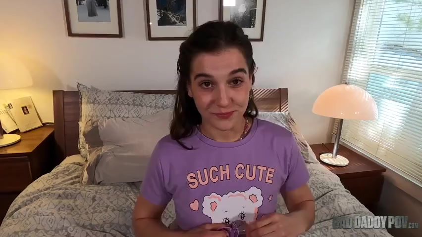 Brunette teen Kasey Wonder is wearing shorts and a purple tee and gives JOI in bed to their horny daddy.
