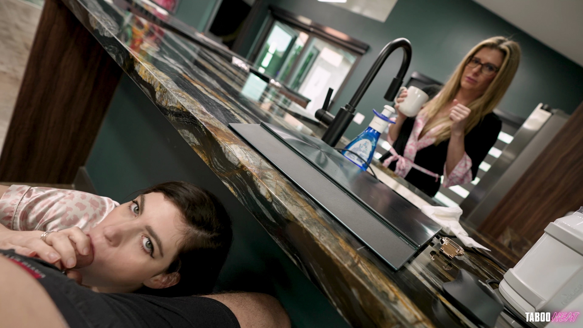 My adorable step-daughter is wearing a cute set of pajamas, as she walks into the kitchen to greet me in the morning. I ask her to unbutton her top for me, and expose her big, natural breasts. I have Nicole get down on her knees under the kitchen table and she starts to suck my cock. My wife, Cory Chase, walks into the kitchen and she's standing on the opposite side of the kitchen table so she is unstable to see Nicole sucking my cock. I keep chatting with my wife and she doesn't notice that anything is happening right in front of her eyes! Cory walks off to the shower, leaving Nicole and me alone! She continues to give me a blowjob, and then she sits down on the chair and waits for me to fuck her pussy in the missionary position. While she is still sitting in the chair, I start to fuck her ass next. We move over to the living room couch and she lies down on her back. I continue fucking her pussy and her ass, back and forth, in the missionary position. When I am done using her holes, I ask her to grab my car keys for me because I need to head off to work. 'Don't forget to send me those nude photos!' I remind her.